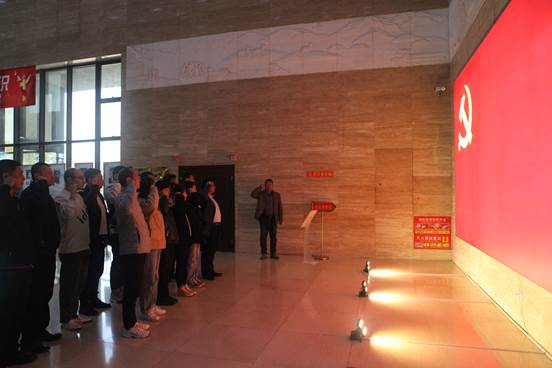 参观学习前,在地质博物馆一层党建学习园地,保卫处综治办党支部副书记桂晓兵带领全体党员面对党旗,重温入党誓词。