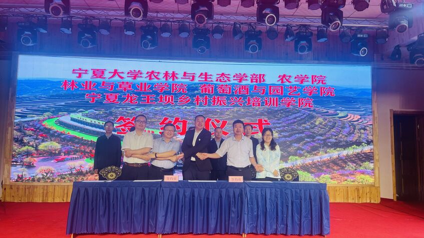 宁夏龙王坝乡村振兴培训学院与农林与生态学部、农学院、林业与草业学院、葡萄酒与园艺学院共同签署了共建教学科研实践基地合作协议,吉强镇人民政府与农学院、林业与草业学院、葡萄酒与园艺学院共同为教学科研实践基地揭牌。
