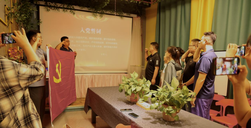 全体党员在党旗下进行宣誓,重温入党誓词。