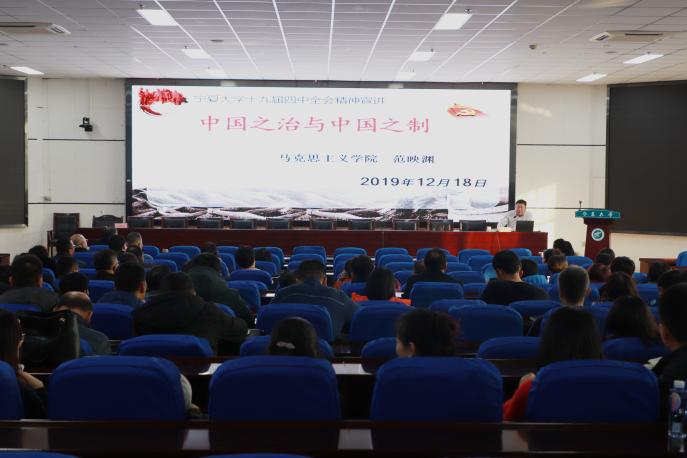 【澳门十大信誉网赌大全新闻中心讯 李学武/文、李明花/图】12月18日,机关党委在贺兰山校区文荟楼报告厅举办党的十九届四中全会精神专题辅导报告会。马克思主义学院院长范映渊受邀为机关全体教职工作党的十九届四中全会精神宣讲报告。