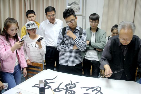 自治区原人大常委会副主任余今晓、中国书法美术创作中心终身荣誉教授、区文史馆馆长曾玉强先生、银川市政协书画院院长助理尤银春一行五名我区著名书画专家、宁夏书画函授专修学院名誉院长丁生俊老师,学生处、团委、老干部处等相关领导以及学校爱好书画的教师、学生一百多人参加了揭牌仪式,校党委副书记王宏伟莅临现场参加了书法活动。