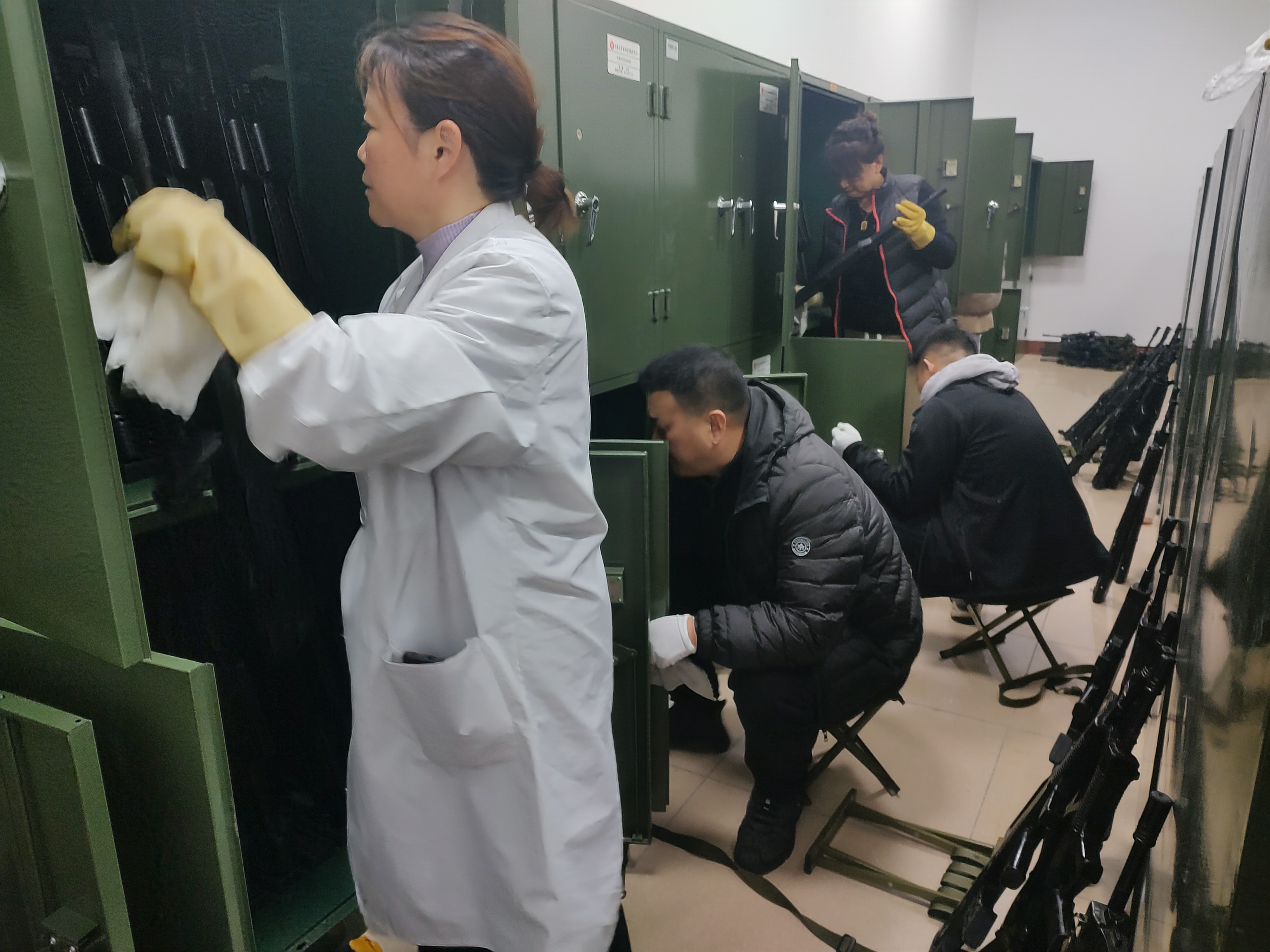 活动中,老师们分工协作、快速高效地对器材柜中的训练模拟枪支逐一进行擦拭保养、检查维修、整齐摆放,通过大家不懈地努力,近千支模拟枪支整齐划一、焕然一新,器材库室干净整洁,规范有序。通过此次活动的开展,有力提升了人民武装部教职工的爱装管装意识,增强了训练器材的完好率,不断提高了人民武装部正规化建设水平。