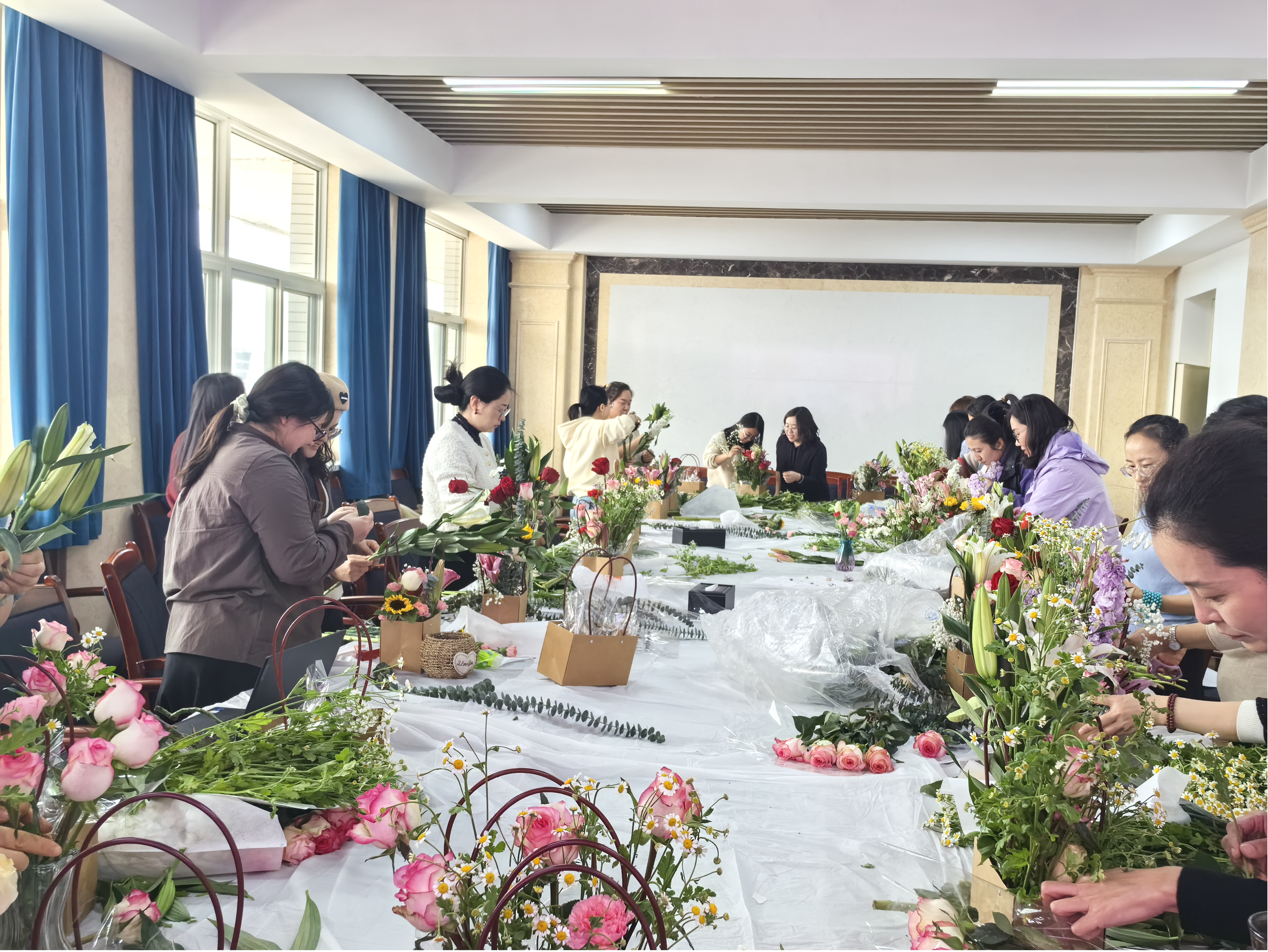 清新淡雅的康乃馨,婀娜多姿的百合,浓烈绚烂的玫瑰,金色活泼的向日葵......在一片芬芳的花儿世界中,插花艺术创作拉开帷幕。活动现场,剪接、绑枝、粘贴,大家忙得不亦乐乎。她们用心构思、精心创作,在颜色、角度、层次等方面不断尝试,将不同的花材错落有致地搭配在一起,再添加绿色枝叶作为衬托,随后,一簇簇美丽别致、层次丰富的花卉在花篮里悄然绽放。大家欣赏着自己创作的插花作品,感到满满的成就感与幸福感。