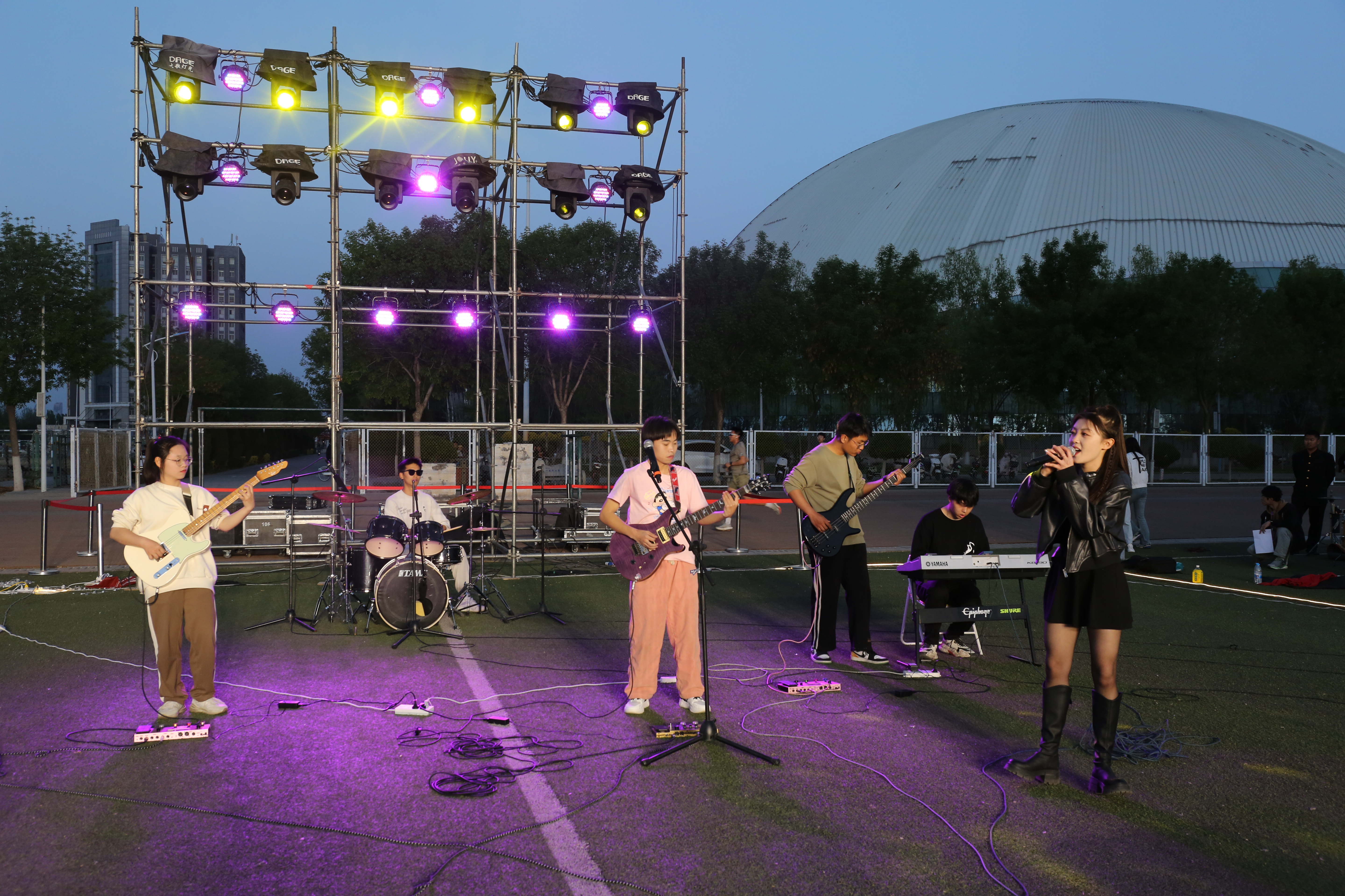 动感的节奏声中,麒麟乐队带来的歌曲《鲜花》《日不落》《王妃》拉开了展演的序幕。丹青一抹千年风华,戏曲《锁麟囊·春秋亭》选段惊艳四座。《狂浪生》娓娓动听,温暖治愈的氛围流淌在《如果有来生》的音符间,合唱表演《一荤一素》轻柔地讲述那安静动听的故事,《别叫我达芬奇》《恋爱ing》带来欢脱的旋律,热情似火的表现将现场气氛推向高潮。舞蹈节目《Latin girls》和《阳光男孩,阳光女孩》展现了活力四射的青春朝气,古典舞《醉》刚柔并济,舒展之间尽是典雅之姿。朗诵表演《可爱的中国》《梦系南疆》令人身临其境。最终展演以贰柒乐队的歌曲《贺兰山巅》《爱要坦荡荡》《山海》缓缓落下帷幕。