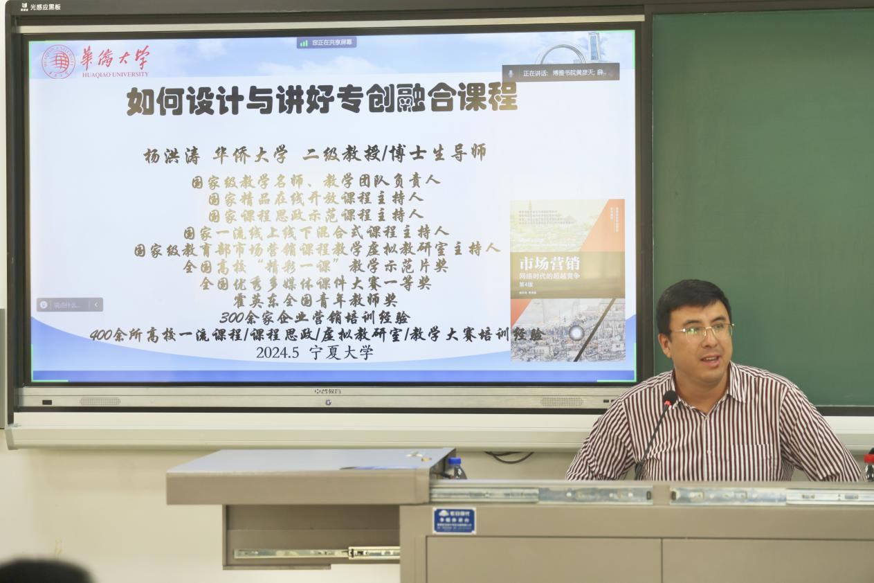 【澳门十大信誉网赌大全新闻中心讯 创新创业学院】为进一步深化信誉网赌创新创业教育改革,提升教师教育教学水平,促进教师课程教学改革创新,5月7日,澳门十大信誉网赌大全 “专创融合及课程教学改革创新能力提升 ”师资培训在贺兰山校区举办,本次培训邀请了华侨大学博士生导师杨洪涛教授主讲。