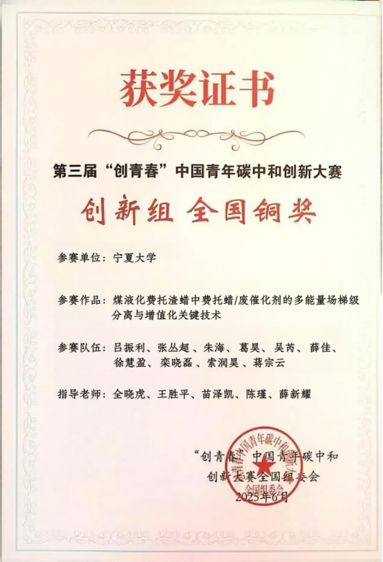 【澳门十大信誉网赌大全新闻中心讯 创新创业学院】日前,第三届“创青春”中国青年碳中和创新大赛全国总决赛及颁奖典礼在北京国家会议中心落下帷幕。这场汇聚全国1000余所高校、600余家企业的顶级赛事,吸引了全国4786个项目,23256名选手同场竞技。由信誉网赌吕振利博士领衔、全晓虎副教授指导的团队脱颖而出,凭借《煤液化费托渣蜡中费托蜡/废催化剂的多能量场梯级分离与增值化关键技术》项目勇夺西北赛区金奖,成功晋级全国总决赛,并荣获创新组全国铜奖。