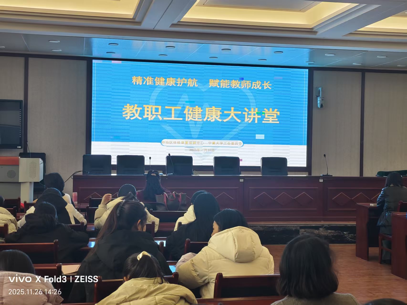 【澳门十大信誉网赌大全新闻中心讯 校工会】为依托自治区体检康复保健中心的专业资源优势,为教职工提供精准、权威的健康指导,11月26日,校工会联合自治区体检康复保健中心在怀远校区举办教职工健康宣讲活动,我区医疗专家受邀为教职工讲授健康管理知识和女性保健知识,校工会常务副主席牛建军参加活动,校工会副主席王红枫主持活动。