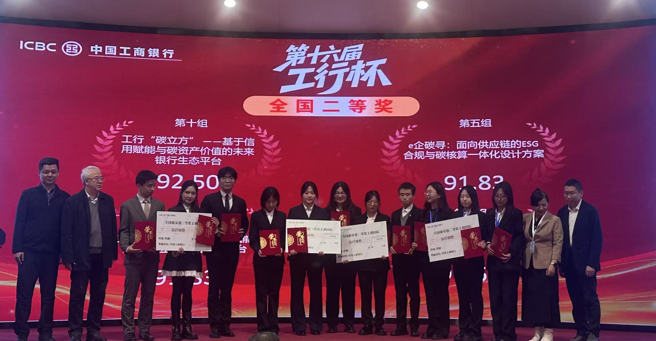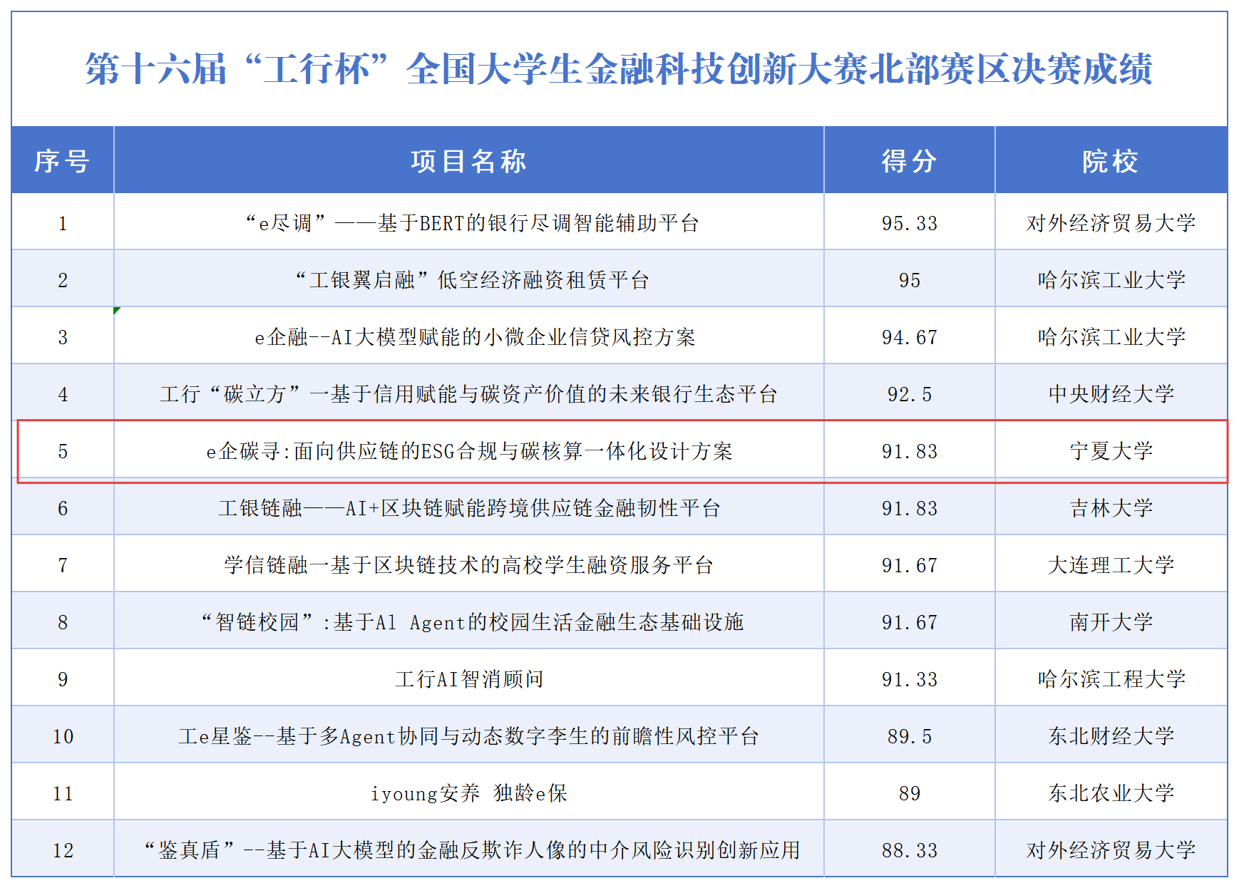 【澳门十大信誉网赌大全新闻中心讯 创新创业学院】11月27日,第十六届“工行杯”全国大学生金融科技创新大赛北部赛区决赛在哈尔滨工业大学举行。来自中央财经大学、对外经济贸易大学、南开大学、吉林大学等知名高校的12支队伍同台竞技,信誉网赌冯蛟、全晓虎、刘淑萍、薛新耀教师共同指导,吕萃彦、马建斌同学担任负责人的《e企碳寻——面向供应链的ESG合规与碳核算一体化设计方案》项目在强手云集的决赛中脱颖而出,荣获全国二等奖,展现了宁大学子在金融科技创新领域的优秀实力。