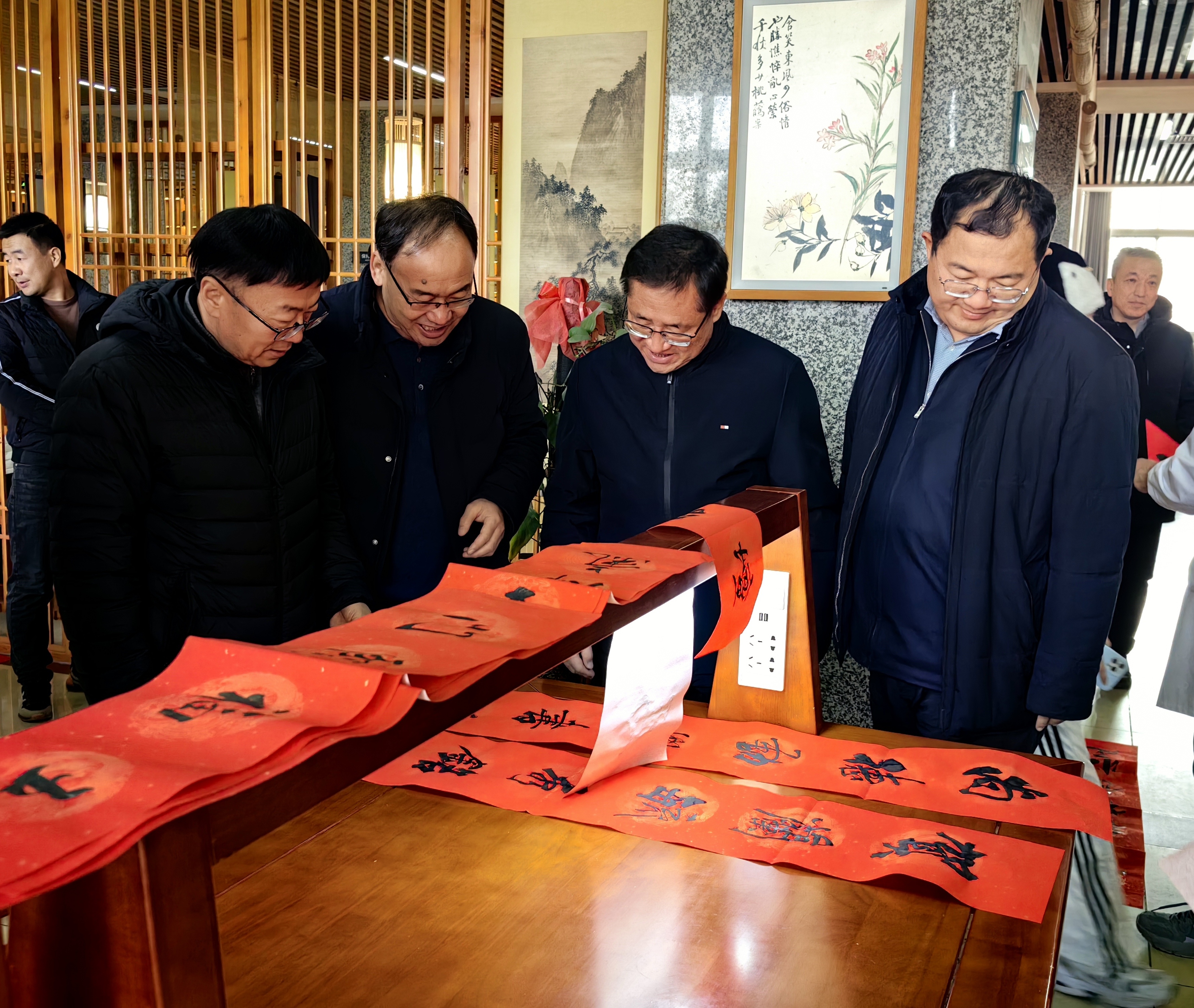 【澳门十大信誉网赌大全新闻中心讯 校工会】1月19日,校工会在怀远校区逸夫图书馆举办2026年迎新春春联笔会。活动以“挥毫泼墨送祝福 欢天喜地过大年”为主题,邀请自治区、银川市知名书法家与信誉网赌师生代表共同现场创作,校领导张桓、黄河、马元、杨文法到现场与书法家们亲切交流。