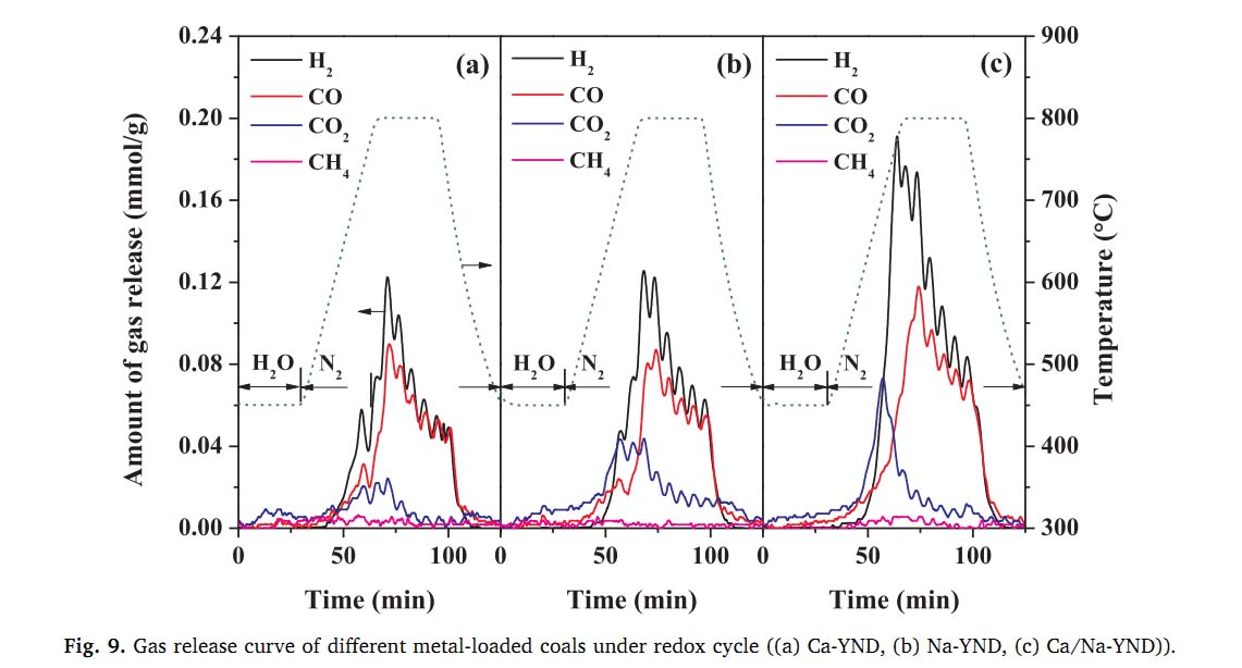 负载不同金属煤焦在氧化还原循环过程中气体释放曲线(a) Ca-YND, (b) Na-YND, (c) Ca/Na-YND)