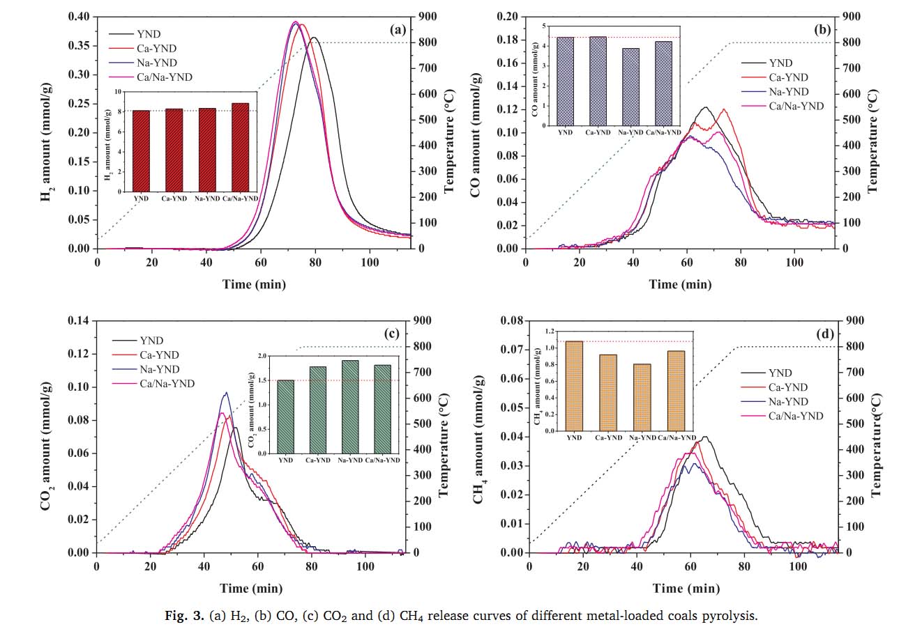 气化过程中排放的CO2既是温室效应的“贡献者”,又是碳资源的物质载体,开发利用气化过程产生的CO2具有重要意义。气流床气化炉以CO2替代N2作为粉煤输送介质、CO2返炉替代部分水蒸气实现固定床加压气化含酚废水减排等技术便是体现。以上过程均涉及煤焦与H2O/CO2共气化反应特性问题。由于CO2和H2O分子解离能力及扩散速率不同,焦-H2O反应速率是焦-CO2反应速率的2-5倍,论文作者前期的研究工作表明碱金属及碱土金属(AAEM)催化作用下CO2与H2O交互作用可促使煤焦-H2O/CO2共气化过程中表现出协同效应,CaO是钙催化共气化反应产生协同效应的主要化学形态,H2O的存在不仅可有效抑制CaO的烧结,提高其在煤焦表面的分散性而且能够促进CO2向CaO表面的吸附,使CO2更快地解离并迅速与煤焦发生气化反应。然而,高温条件下CaO的严重烧结使得其吸附CO2的能力较弱,导致共气化反应过程中的协同效应程度随温度的升高逐渐减弱,Na的存在可有效拓展协同效应产生的温区。但对于Ca/Na双金属催化剂促进协同效应产生的原因尚不清楚,为揭示该问题,特开展本研究工作。结果表明,Ca/Na存在可改变热解过程中气体的释放量及分布规律,同时对热解半焦的结构产生重要影响。
