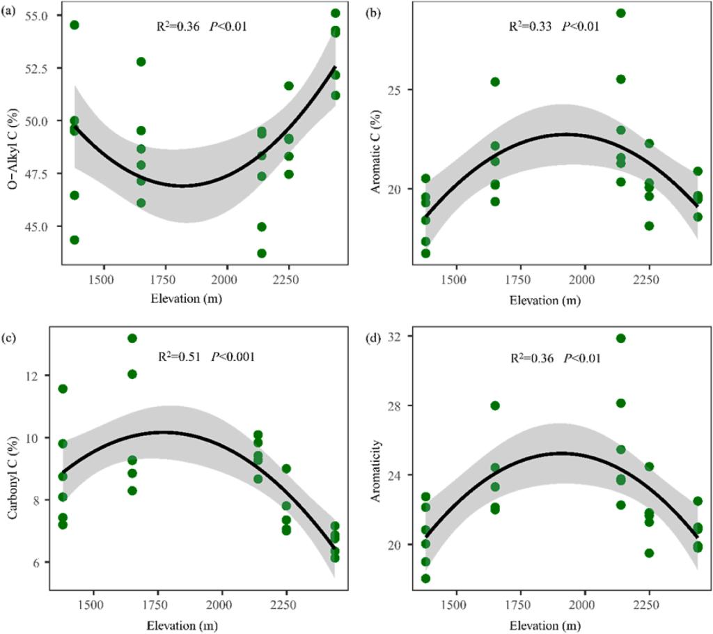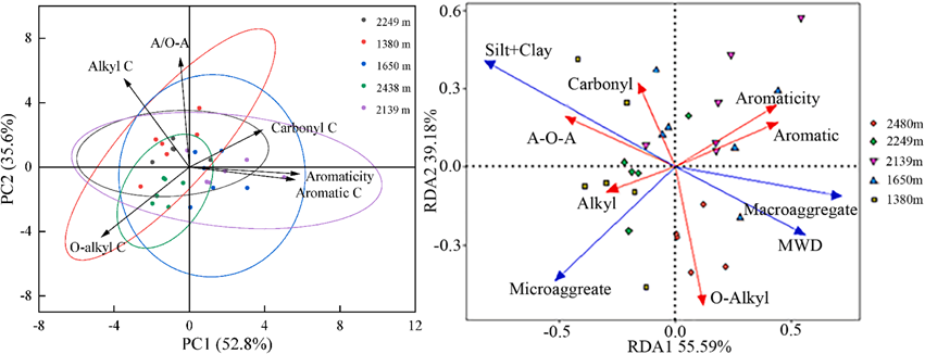 研究发现,贺兰山随海拔升高,土壤主要团聚体由微团聚体转变为大团聚体,团聚体稳定性在中高海拔显著高于低海拔。固体13C NMR波谱分析表明有机碳化学组分在贺兰山不同海拔差异显著,其中氧烷基碳是贺兰山有机碳的主要化学组分,芳香碳含量的变化是导致有机碳化学组分海拔分异的主要成分。不同有机碳化学组分含量随海拔升高均呈现单峰变化趋势,易分解的氧烷基碳在中海拔最低,而结构稳定的芳香碳、羰基碳及有机碳稳定性指标芳香度均在中海拔达到最高(图1)。大团聚体的物理保护和芳香烃的化学保护可能是贺兰山土壤有机碳在不同沿海拔梯度存储的主要机制。相较于土壤有机碳化学组分,土壤团聚体分布和稳定性对气候和土壤因子响应敏感(图2),因此在脆弱山地生态系统的经营中应加强对团聚体的保护,以提高有机碳的稳定性。