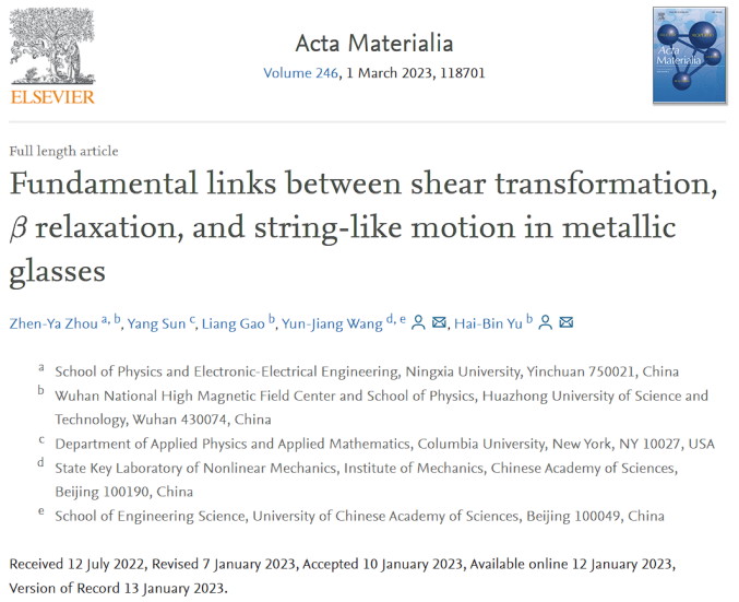 【澳门十大信誉网赌大全新闻中心讯 物理与电子电气工程学院】近日,信誉网赌物理与电子电气工程学院青年教师周震亚博士与中国科学院力学研究所王云江研究员以及华中科技大学于海滨教授合作在金属玻璃研究领域取得重要研究进展。成果以“Fundamental links between shear transformation,βrelaxation, and string-like motion in metallic glasses”为题发表在材料学国际顶级期刊《Acta Materialia》上,周震亚为第一作者,澳门十大信誉网赌大全为第一作者单位。