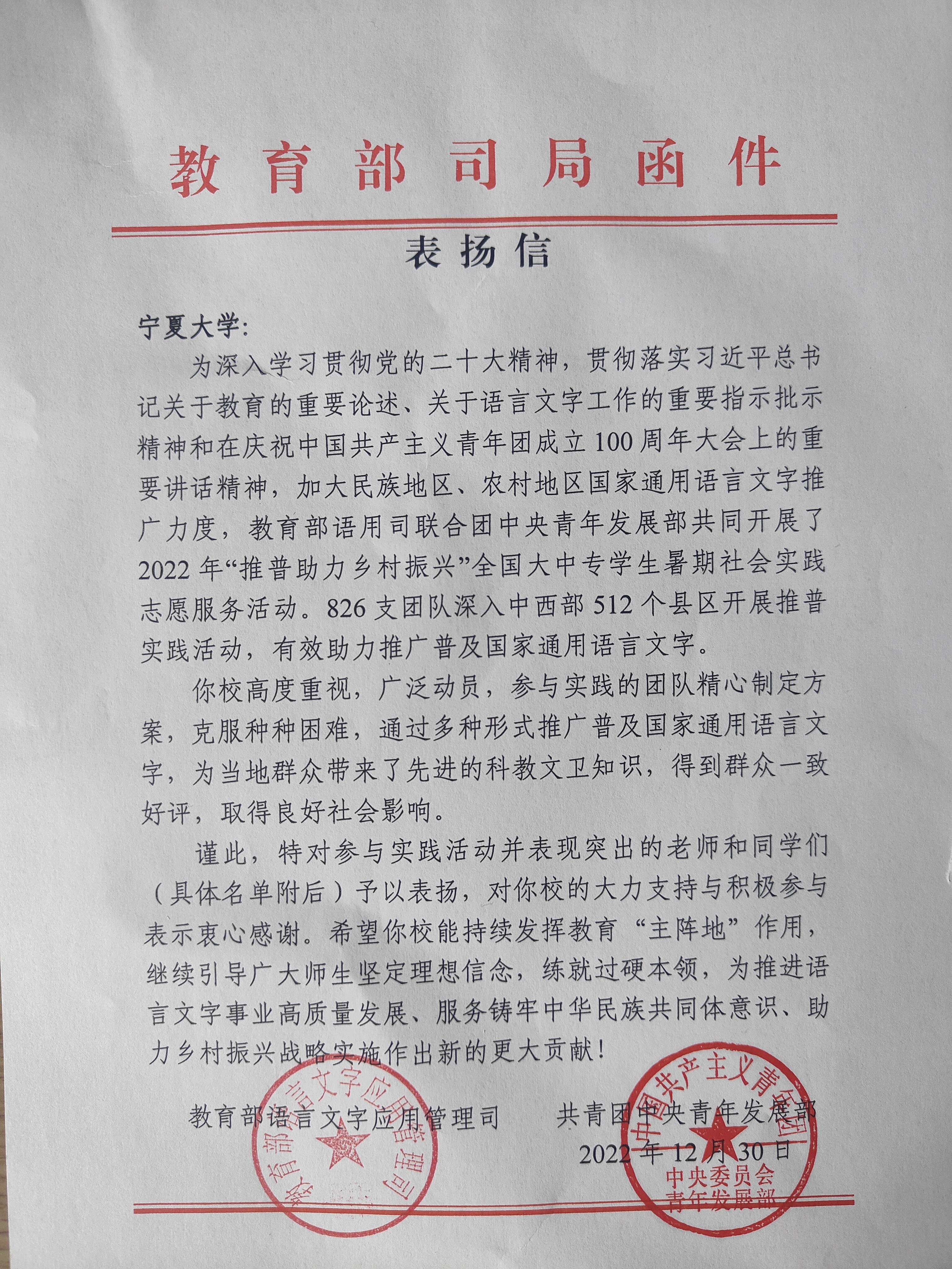 由信誉网赌文学院副教授杨睿老师指导、文学院9名本科生组成的“乐享汉语”推普团队,被评为2022年“推普助力乡村振兴”全国大中专学生暑期社会实践志愿服务活动优秀团队荣誉称号,并收到教育部语言文字应用管理司和共青团中央青年发展部寄来的表扬信。