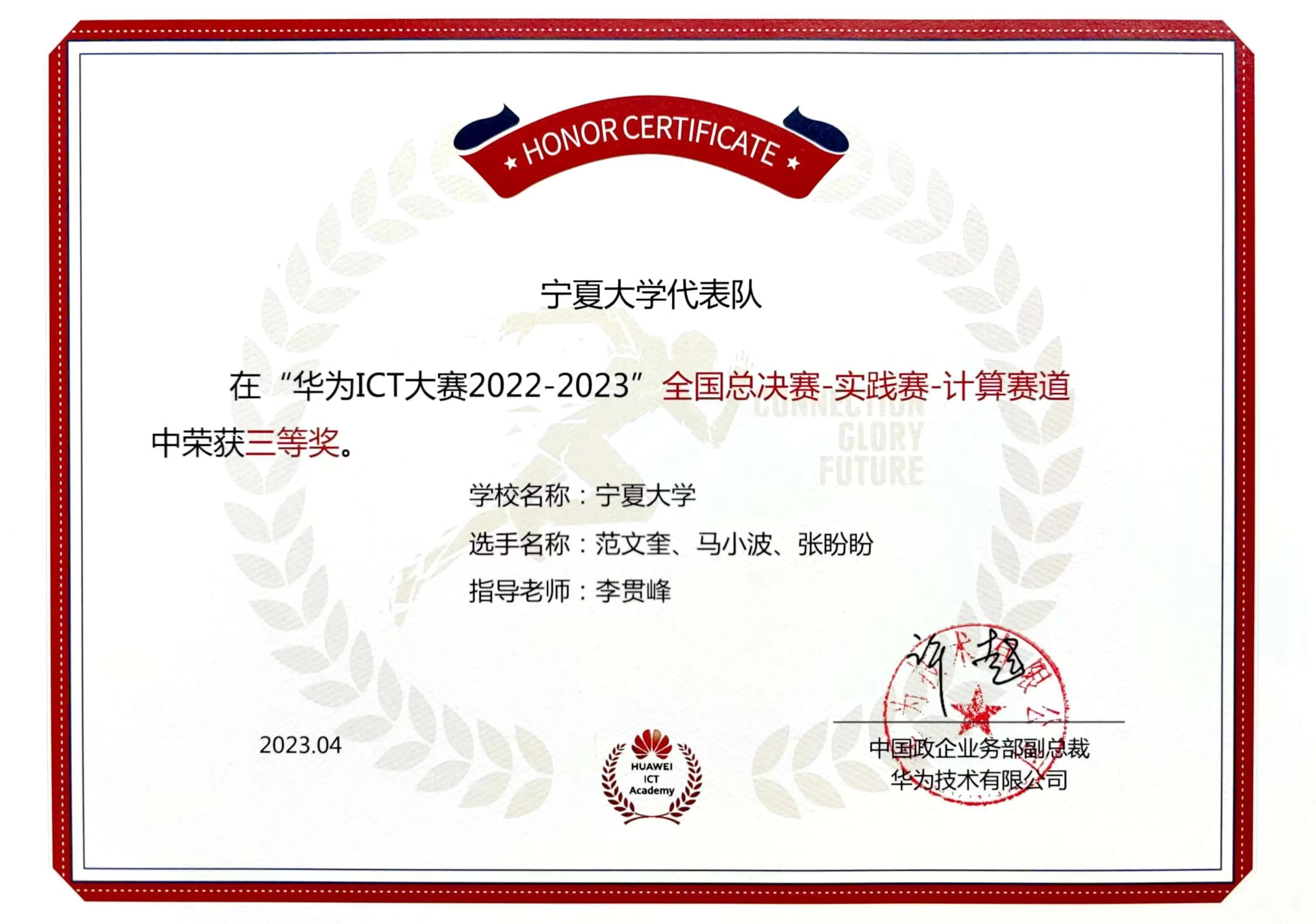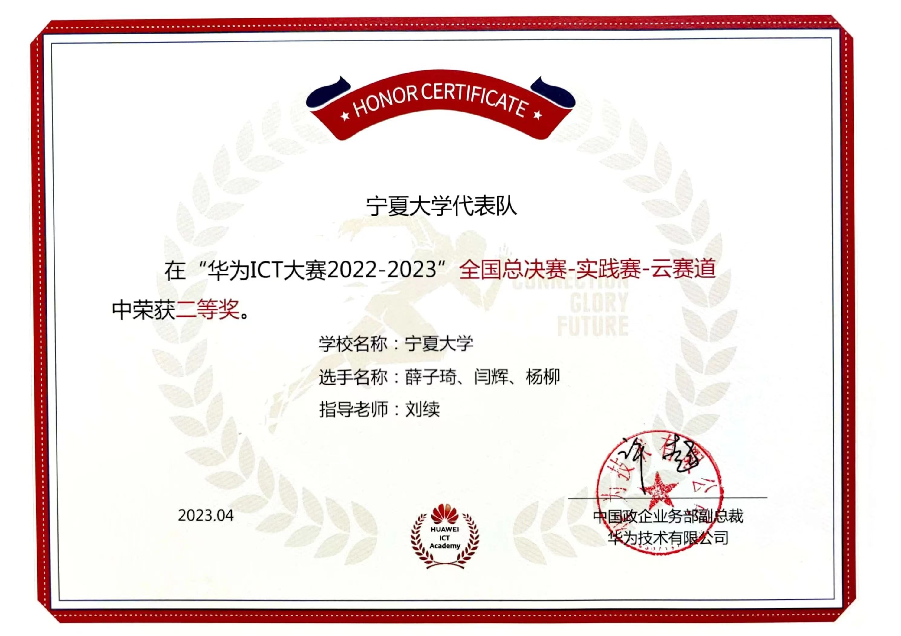 【澳门十大信誉网赌大全新闻中心讯 信息工程学院】“全球决赛三等奖,实现宁夏7年来该项赛事奖牌零的突破”,由信息工程学院刘续老师指导,薛子琦、杨柳、闫辉3名同学组成的参赛队在5月27日华为ICT大赛2022-2023全球总决赛(本科组云赛道)上获得的佳绩。