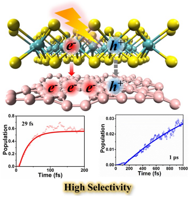硼烯(Borophene)作为一种新型二维材料,凭借其优异的电子特性而引起了广泛的研究兴趣。过渡金属硫族化合物(TMDC)具有优异的半导体性、很强的激子效应,其与硼烯构成的范德瓦尔斯异质结具有强量子限域效应和量子相干效应。异质结中的载流子动力学是承载光电功能性的基础,从原子尺度深入理解硼烯与TMDC间的载流子激发态动力学过程将为设计和优化器件性能提供重要的理论指导。马薇课题组基于含时密度泛函理论,利用实时演化的从头算非绝热分子动力学(NAMD)方法,从原子尺度系统研究了硼烯与MoS2之间的量子相互作用和载流子激发态动力学过程,发现不同的硼烯同素异形体与MoS2之间的载流子激发态动力学过程展现出选择性的电荷传输行为。进一步的分析还表明,不同硼烯同素异形体与MoS2之间形成的不同肖特基势垒、电子耦合,以及不同声子模式的参与共同促成了层间的选择性电荷传输动力学过程。该研究结果从原子尺度深入理解了硼烯与MoS2之间的量子相互作用与载流子激发态动力学过程,加深了对范德瓦尔斯异质结中量子相互作用机制的理解,并为高效光电、光伏器件的设计提供了新的视角。