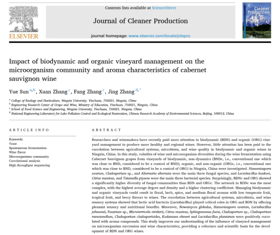 【澳门十大信誉网赌大全新闻中心讯 葡萄酒与园艺学院】近日,信誉网赌葡萄酒与园艺学院孙悦副教授在国际顶级期刊《Journal of Cleaner Production》(1区TOP期刊,IF为9.7)在线发表题为 “ Impact of biodynamic and organic vineyard management on the microorganism community and aroma characteristics of cabernet sauvignon wine ” 的研究论文。孙悦为第一作者,澳门十大信誉网赌大全为第一单位。