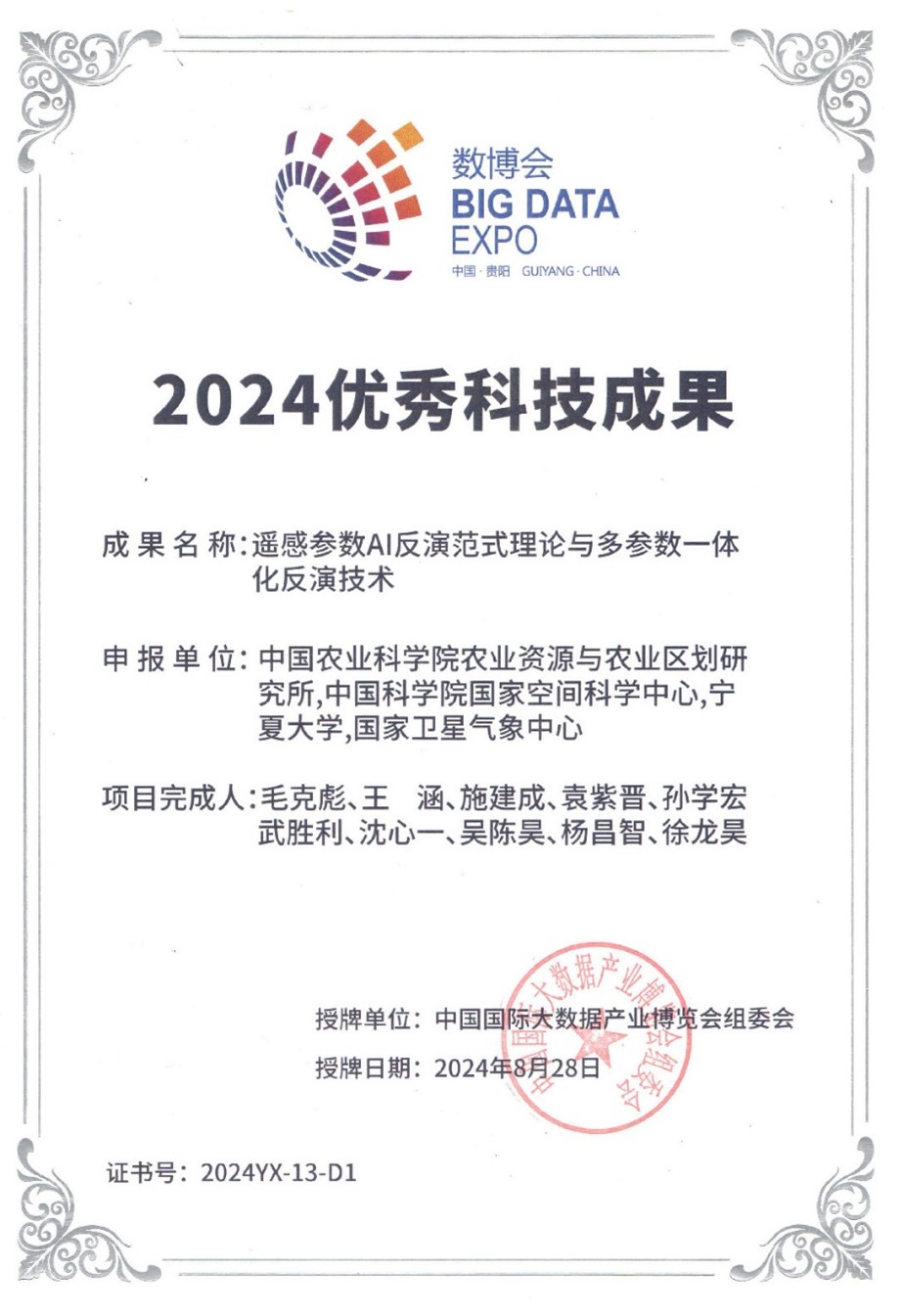 【澳门十大信誉网赌大全新闻中心讯 电子与电气工程学院】近日,在2024年中国国际大数据产业博览会(数博会)上,澳门十大信誉网赌大全作为主要参与单位之一,与中国农业科学院农业资源与农业区划研究所、中国科学院国家空间科学中心和国家卫星气象中心等单位联合研发的“遥感参数AI反演范式理论与多参数一体化反演技术”项目荣获2024中国国际大数据产业博览会优秀科技成果奖,展示了澳门十大信誉网赌大全在大数据与人工智能技术结合遥感监测领域的卓越贡献。