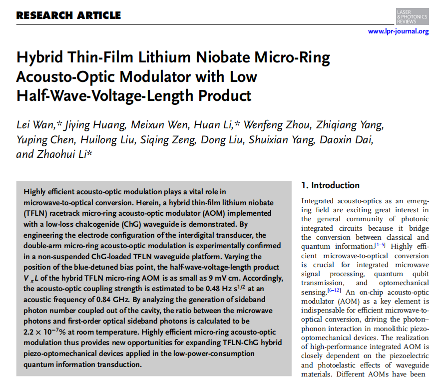 【澳门十大信誉网赌大全新闻中心讯 物理学院】近日,信誉网赌物理学院万磊教授团队在高效薄膜铌酸锂微环声光调制器研究方面取得重要成果,该工作以“Hybrid thin-film lithium niobate micro-ring acousto-optic modulator with low half-wave-voltage-length product”为题发表在光学领域国际顶级期刊《Laser & Photonics Reviews》(中科院1区Top,IF=9.8)。研究生黄继莹和温美逊为共同第一作者,万磊教授为第一作者与第一通讯作者,浙江大学李欢研究员和中山大学李朝晖教授为论文共同通讯作者,澳门十大信誉网赌大全为第一完成单位。