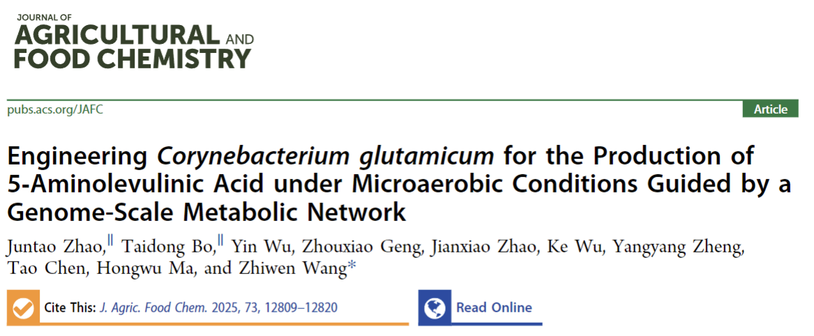 【澳门十大信誉网赌大全新闻中心讯 生命与食品学部】近日,澳门十大信誉网赌大全/天津大学王智文团队在农业和食品化学领域期刊《Journal of Agriculture and Food Chemistry》(一区TOP,2024 IF:5.7)上发表封面论文,基于基因组尺度网络模型模拟分析了不同溶氧条件下谷氨酸棒杆菌合成5-ALA的最优代谢通量分布,结合代谢工程首次实现了谷氨酸棒杆菌微好氧条件下5-ALA的生物合成。