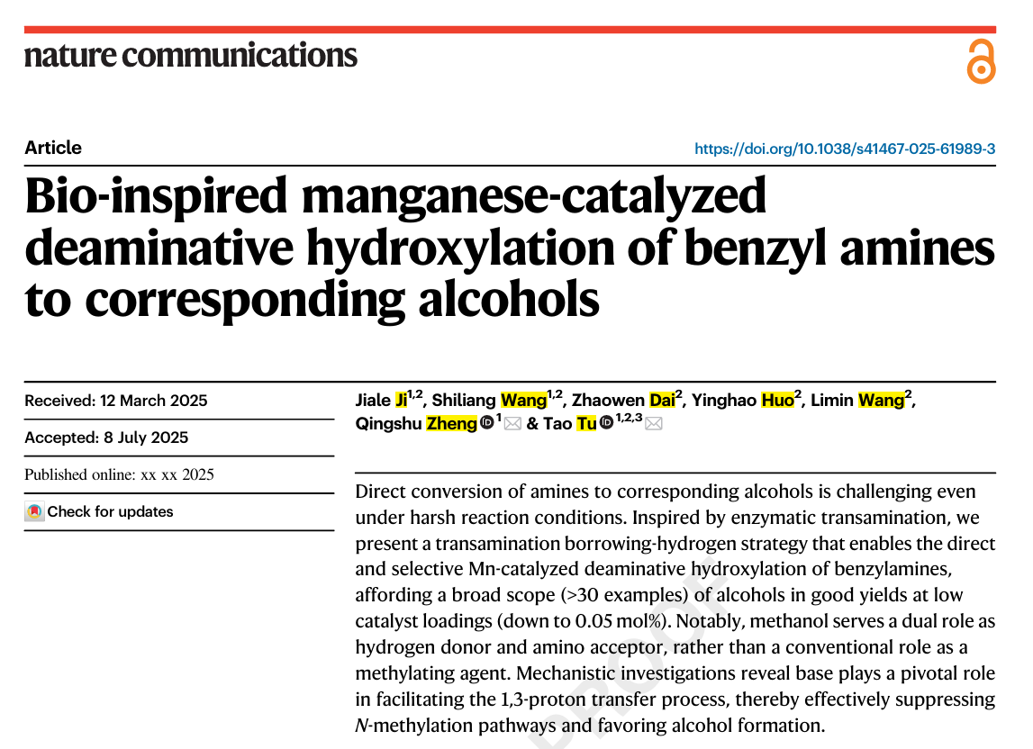 【澳门十大信誉网赌大全新闻中心讯 化学化工学院】近日,澳门十大信誉网赌大全化学化工学院在锰催化苄胺脱胺羟基化合成醇方面取得重要进展。在澳门十大信誉网赌大全化学工程与技术教育部“双一流”学科经费支持下,化学化工学院(省部共建煤炭高效利用与绿色化工国家重点实验室) 涂涛/郑庆舒团队提出了一种“转氨-借氢”策略,相关研究成果以研究论文形式发表于国际顶级期刊《Nature Communications》(DOI: 10.1038/s41467-025-61989-3)。涂涛教授、郑庆舒博士为论文共同通讯作者,澳门十大信誉网赌大全为第一署名单位。
