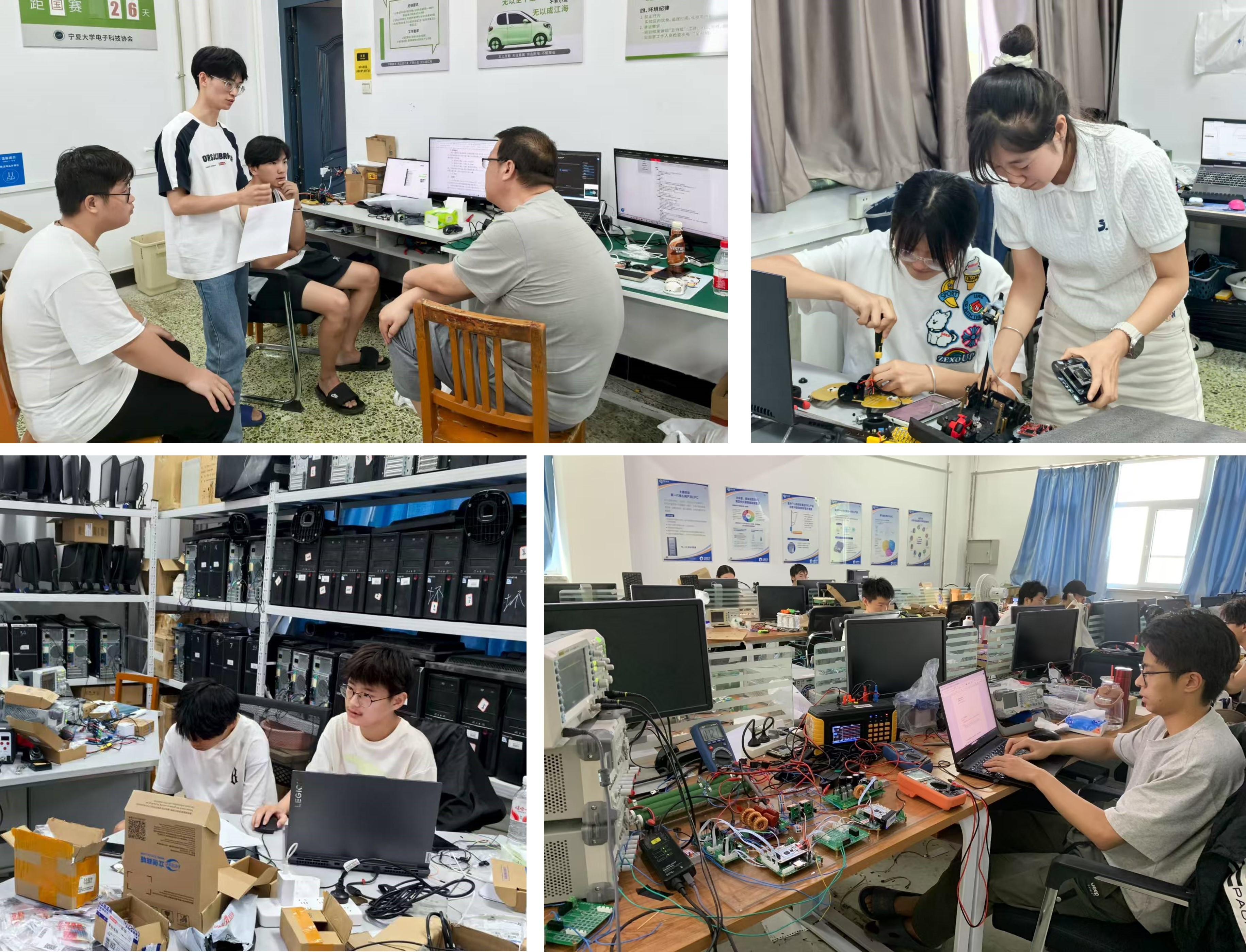 学院长期以来高度重视本项赛事,组建了经验丰富的指导教师团队,全程为学生提供系统支持——从前期选题指导、技术难点预判,到比赛中期的方案优化与实时攻关,助力学生稳步推进。竞赛期间,学院领导亲临现场,慰问鼓励参赛学生,详细了解赛事进展、学生状态与硬件保障情况。在四天三夜的紧张赛程中,参赛学生在教师指导下紧密协作,按作品设计目标有序分工。面对元器件兼容性不足、程序稳定性波动等突发问题,师生携手通宵攻坚,反复调试、持续优化,最终确保所有作品顺利提交。