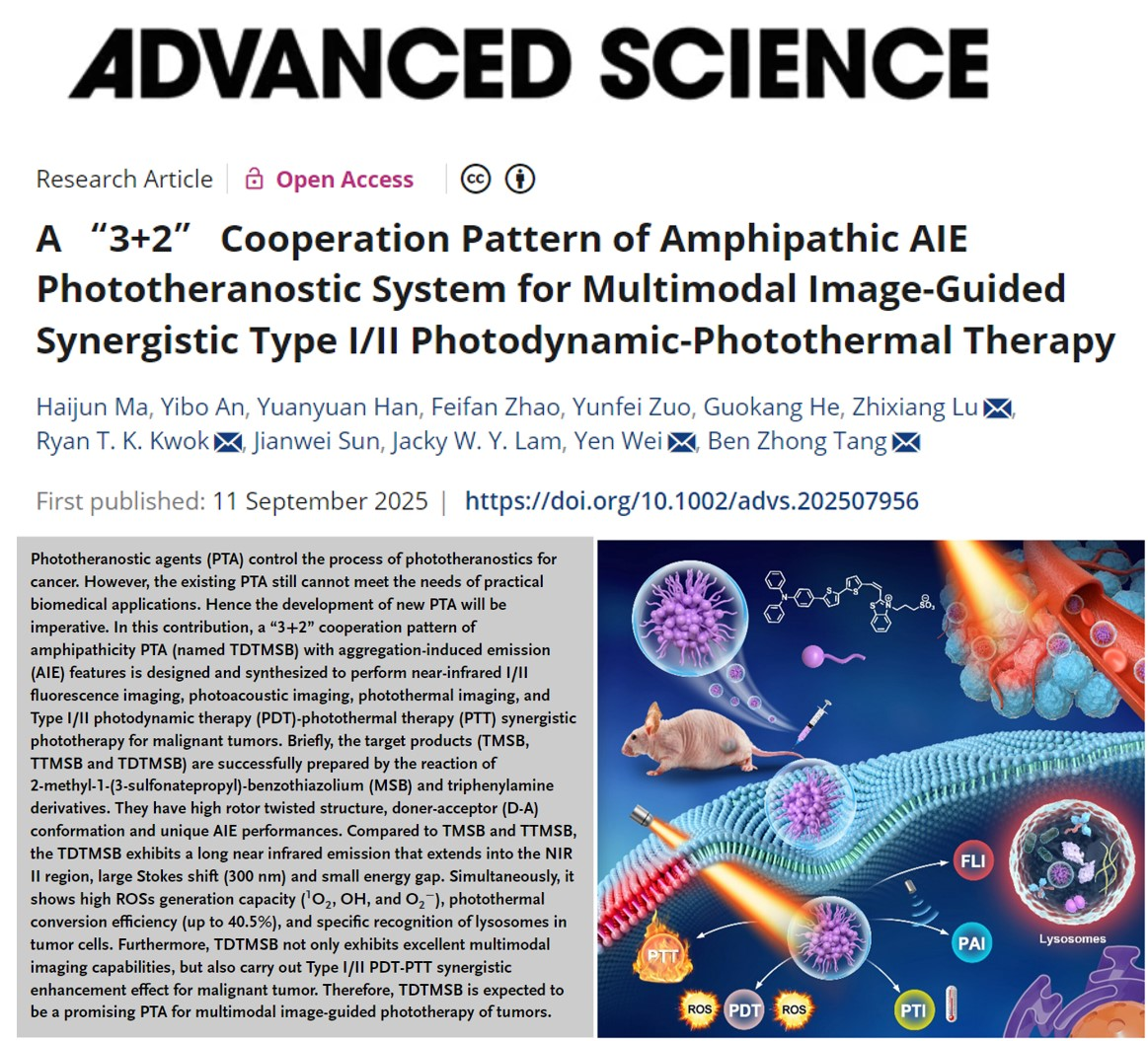 【澳门十大信誉网赌大全新闻中心讯 生命科学学院】近日,生命科学学院马海军副教授与厦门大学、清华大学、香港科技大学、香港中文大学合作在国际综合性高水平期刊Advanced Science上发表了题为“A‘3+2’ Cooperation Pattern of Amphipathic AIE Phototheranostic System for Multimodal Image-Guided Synergistic Type I/II Photodynamic-Photothermal Therapy”的研究论文。论文第一作者为马海军副教授,通讯作者为厦门大学陆治香教授、清华大学危岩教授、香港科技大学Ryan T. K. Kwok教授和香港中文大学(深圳)唐本忠教授,澳门十大信誉网赌大全为第一署名单位。