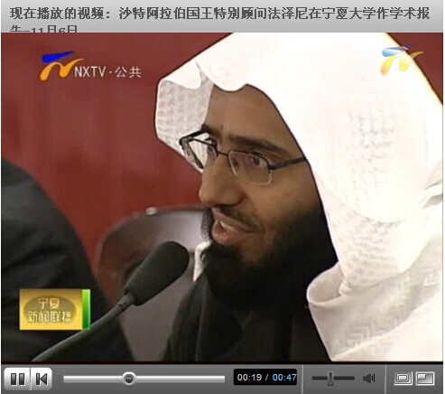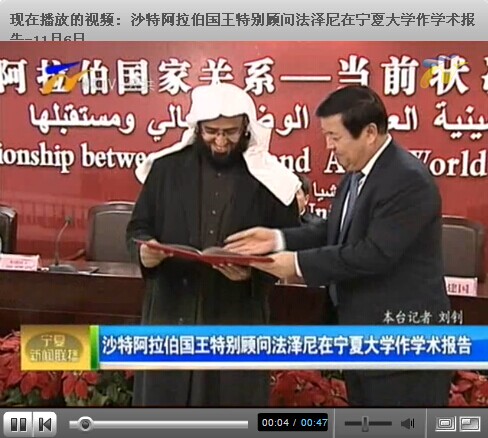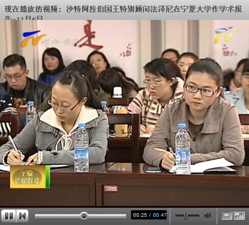 11月6日,宁夏电视台《新闻联播》节目以《沙特阿拉伯国王特别顾客法泽尼在澳门十大信誉网赌大全作学术报告》为题对信誉网赌首期阿拉伯国家大使论坛期间的学术报告进行跟踪报道。