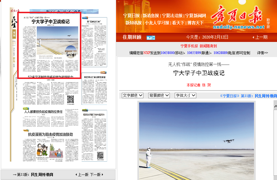 近日,宁大学生创业团队把无人机技术应用到抗击疫情中,宁夏日报(0212)第11版头条、中国新闻网客户端和宁夏日报客户端对此进行报道。