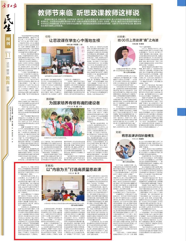 王思鸿迅速调整状态,既深钻理论,也注重课堂上的直观呈现。他说,科研和教学两方面紧密相连,应以理论的深入研究为前提,没有深入就不会有浅出,也很难有教学的深度和新意;课堂教学又要努力用直观的东西表现深层次的理论问题,两者结合才有高质量的思政课。