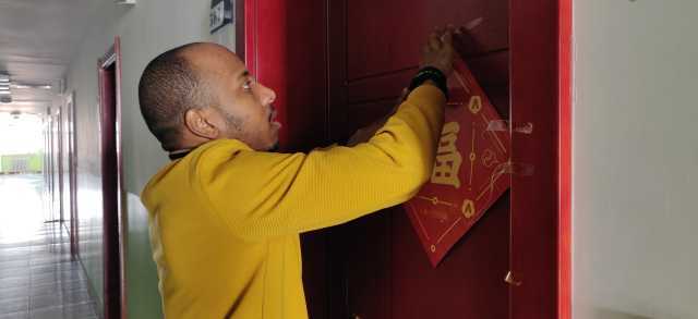萨尼在宿舍门上贴福字。