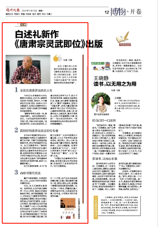 今年已89岁高龄的白述礼教授对记者说,这本书以唐肃宗在灵武(灵武郡,即灵州,今宁夏吴忠市古城)即位、驻晔68天为主题展开,全面论述唐肃宗的人生经历,包括父亲唐玄宗李隆基发动政变称帝。