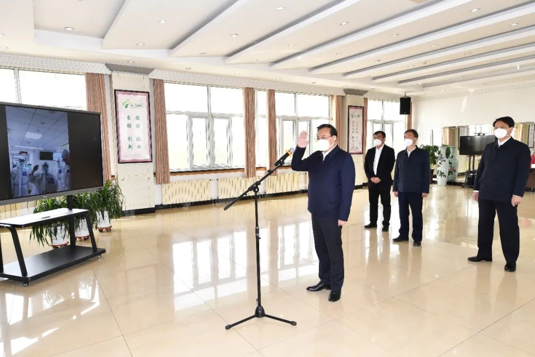 梁言顺在自治区第四人民医院现场连线隔离救治区医护人员,向大家表示慰问。