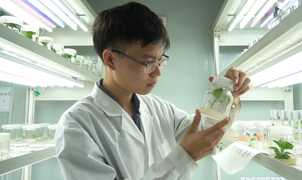 然而,如何在培育箱里给这些叶片保持水分,成了推进实验进程的一大难题。为了给这些小家伙“喂饱水”,池礼鑫和团队成员查阅了许多文献,借鉴了许多前人的方法。然而,均以失败告终。池礼鑫不服气,善于思考的他想到了用花泥培育。把叶片培育和插花结合起来,这是老师和学长们从未想到过的。经过近一周的培育,池礼鑫紧张地打开培养箱,凑近仔细观察后松了一口气:叶片在花泥上长得很好,实验总算能进行下一步了。