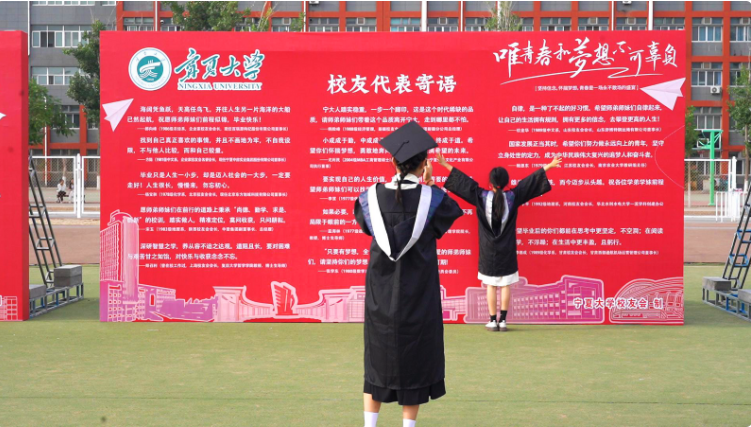 在学校为毕业生精心设计搭建的留影墙前合影。