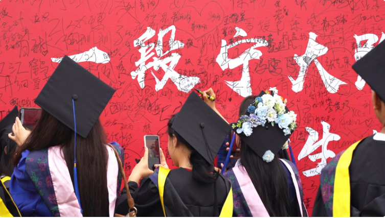 毕业生们纷纷在签名墙上写下自己的名字和对未来的期许。