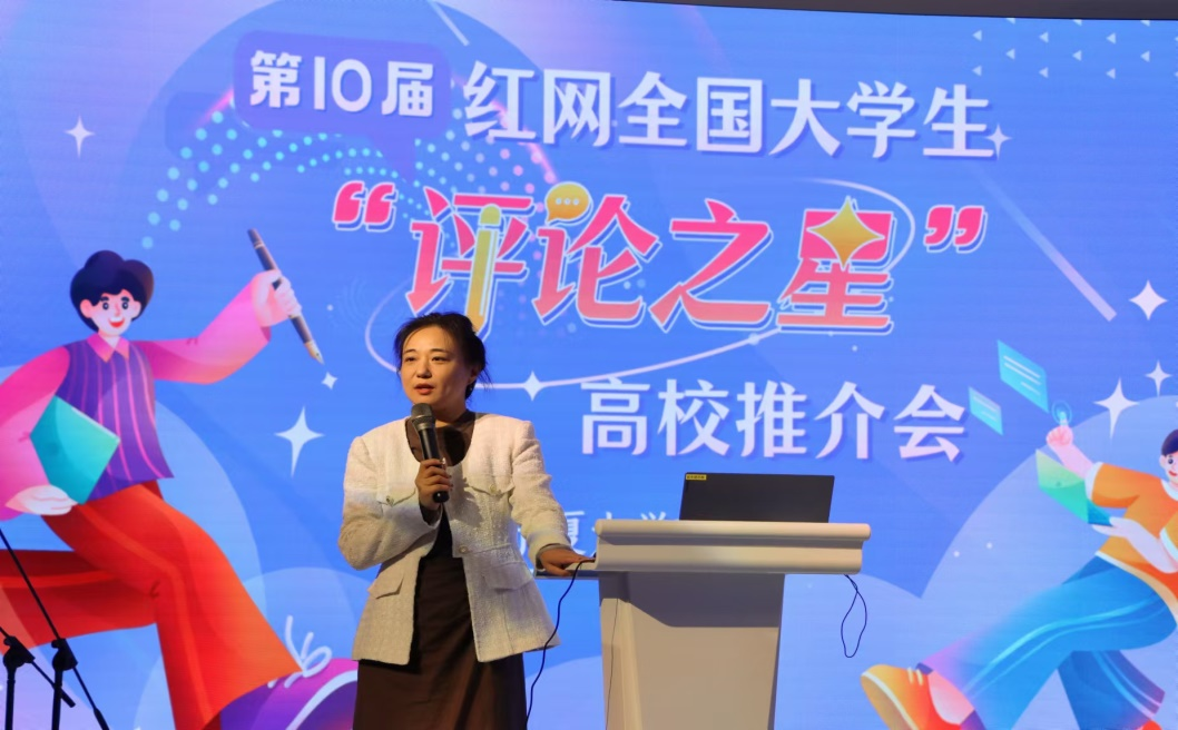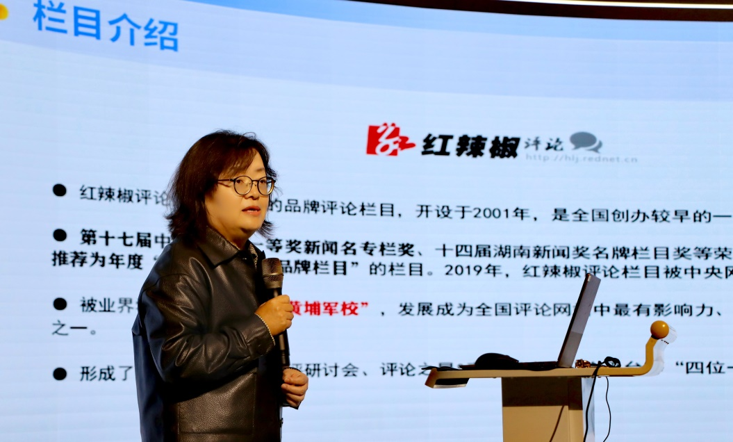 自治区一流本科课程《新闻评论学》负责人谢明辉教授,对红辣椒评论栏目、红网“青年+”模式,以及全国大学生“评论之星”选拔赛的发展历程、专业影响、赛制安排、评奖机制等方面进行了详细介绍。同时,她以往届学子取得的成绩鼓励大家用多种形式表达自己的观点和意见,积极参与“评论之星”选拔赛,在实践中锻炼成长。