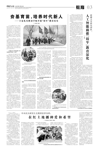 百年大计,教育为本。近年来,宁夏紧紧抓住青少年阶段的“拔节孕穗期”,出台《加强学校铸牢中华民族共同体意识实施方案》,实施青少年学生夯基育苗工程,针对不同学段特点,打造理论铸魂、文化润心、实践促融相衔接的教育体系,浇花浇根、育人铸魂,引导青少年学生牢固树立中华民族共同体意识,成长为堪当民族复兴大任的时代新人。