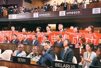 当地时间2025年7月11日,在法国巴黎召开的联合国教科文组织第47届世界遗产大会通过决议,将“西夏陵”列入《世界遗产名录》。至此,中国世界遗产总数达到60项。图为中方代表团在联合国教科文组织第47届世界遗产大会上庆祝“西夏陵”申遗成功。新华社记者 张百慧摄