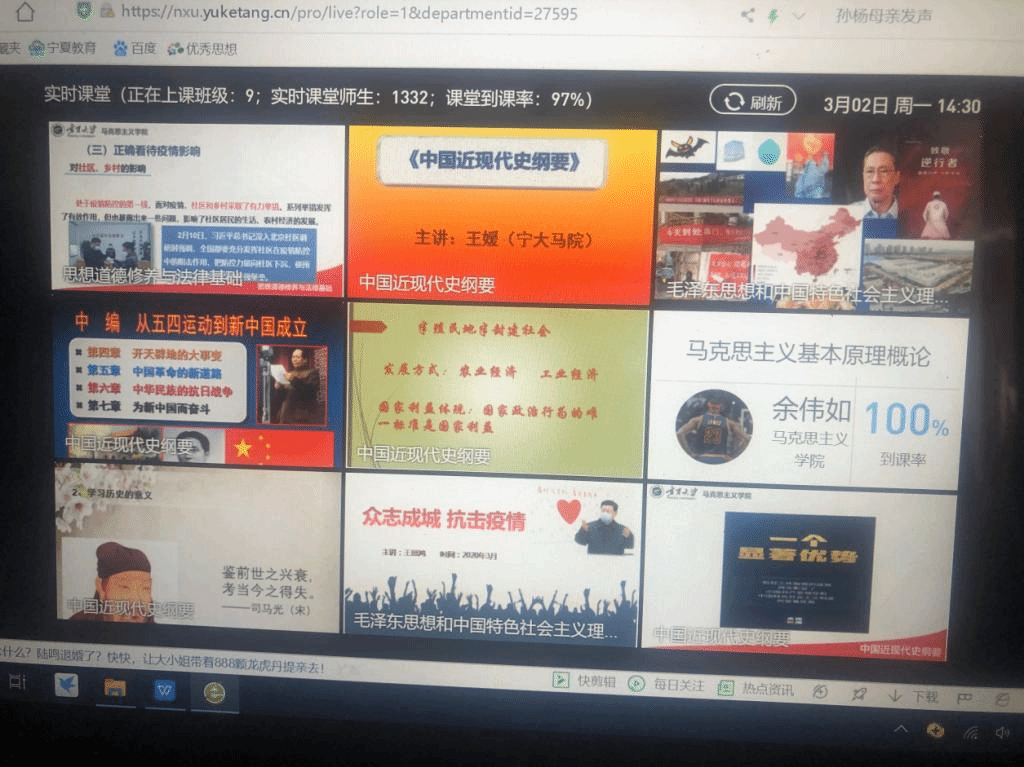 据了解,2月1日以来,马克思主义学院组织教师参加学校、学院及“雨课堂”技术培训和学院教学方案交流会,制定了春季学期本科线上教学A、B、C三方案,进行教学测试及教学流程监控。开课首日,9位承担教学任务的教师按课表、按时间、按班级进行了线上教学,“雨课堂”线上直播率为100%,学生总体签到率为98%,基本实现全新教学手段、全新教学内容和思想政治理论课教学时效性和时效性的有机统一。