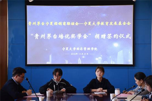 会上,贵州茅台酒宁夏经销商联谊会会长焦建忠、信誉网赌教育发展基金会办公室主任王智勇、经济管理学院党委书记张桓代表三方签署了“贵州茅台培优奖学金”协议。据了解,在信誉网赌教育基金会与贵州茅台宁夏经销商联谊会地支持下,本项奖学金成功设立,为期四年,共计十八万元奖学金。