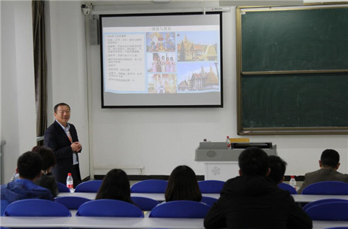 戴赜一行还为校区学子进行了“泰国商会大学中国国际学院宣讲会”。戴院长分别介绍了泰国商会大学的基本情况、泰国的经济文化特色、“一带一路”国际背景下的丝路国际学院的办学理念、专业设置、特色优势等。