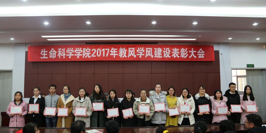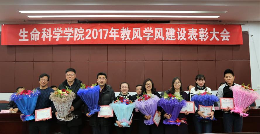 表彰会上,生物化学与分子生物学教师团队荣获学院“2017年度教风建设突出贡献奖”,杨易等八名教师荣获“最受学生欢迎老师”,周涛同学荣获创新创业优秀学生团队。院领导向教风建设表受到表彰的先进集体和先进个人颁发了奖牌和获奖证书。会上,优秀教师代表、获奖学生代表做了交流发言。
