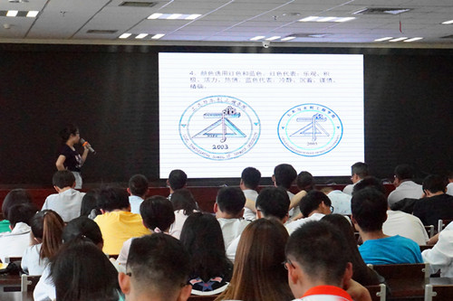 在设计讲解环节中,范乐同学以“土承宏志,水跃未来”的主题进行了设计展示。他以土水学院学院初建时工科楼的照片回溯了学院的发展历史,并以工科楼和实验楼抽象成简洁基本的几何形状作为院徽图案的主体,象征着师生携手,学习实践合二为一。形似“土水”的立面线条则更具体地符合了学院特色。他还向大家展示了院徽在信封信纸、“土水之星”奖杯、文化衫上的变体与衍生。经过激烈角逐,最终范乐同学获得一等奖,燕炳桥同学获二等奖,郜英洲同学获三等奖。
