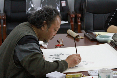 美术学院李耕老师在校区大学生活动中心会议室率先铺宣染墨,泼墨挥毫。各位同学也开始调墨配色,描境写意。