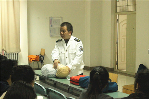 银川市紧急救援中心副主任医师韩自华老师通过多媒体向大家展示了常规的现场急救知识,包括针对呼吸、心脏骤停的不同程度应采取的不同判断、选择方式以及心肺复苏等急救措施。期间,他将救护知识理论、救护技能与日常生活实例相结合,让同学们熟知应如何抓住急救环节的“钻石四分钟”。他还详细介绍了心肺复苏的“胸外心脏按压”、“开放气道”、“人工呼吸”等八个程序,其中包括了“轻拍重唤”、“观察胸廓”等细节,并通过现场模拟心肺复苏术进行知识深度普及,具体讲述了救助过程中需要注意的问题及经常出现的错误,让大家受益良多。