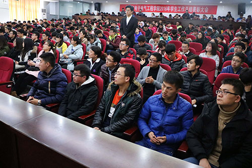 【澳门十大信誉网赌大全新闻中心讯物理与电子电气工程学院】12月23日中午,物理与电子电气工程学院于澳门十大信誉网赌大全怀远校区研究生楼二楼报告厅举办2016年学生工作总结表彰大会。院党委书记车进,院长王旭明,党委副书记王志霄、赵永军,副院长任克亮、陈焕铭、郭中华,学生工作办公室主任聂义民,团委书记秦泗海,16级辅导员王巳卉出席本次大会。大会由赵永军书记主持,我院学生积极参加。