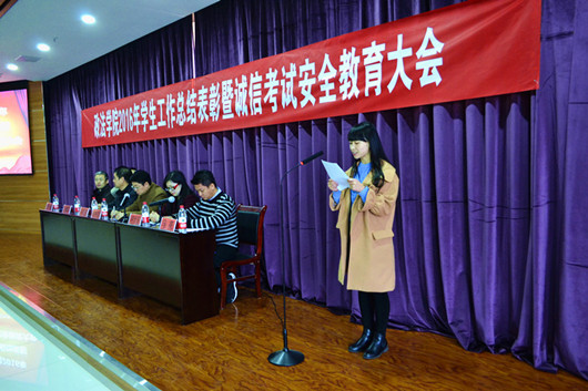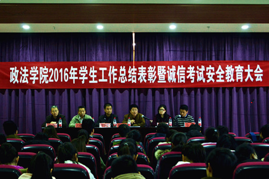 【澳门十大信誉网赌大全新闻中心讯政法学院】2016年12月23日,政法学院在文科楼模拟法庭召开学生工作总结表彰暨诚信考试安全教育大会。政法学院党委书记拜发奎、副书记崔明堂、副院长吕耀军、胡世恩、尹强应邀出席本次大会。学院团委学生会全体干部干事、各班级优秀学生干部代表以及2016级学生参加了本次会议。大会由学生工作办公室主任马亮老师主持。