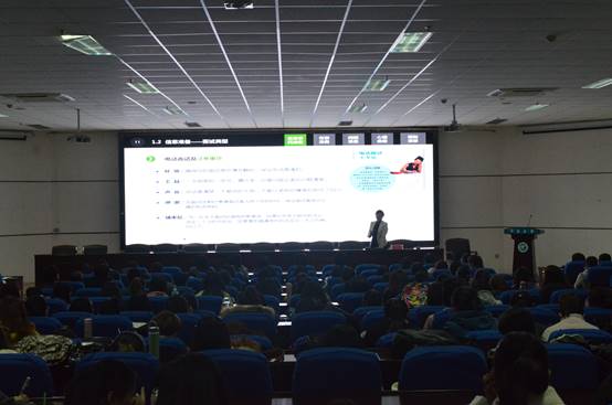 潘瑞老师将毕业生面试前的准备具体分为五个部分,信息资料准备、仪表准备、问题准备、心理准备、模拟进行了详细的讲解。会场的同学们十分投入,认真标记重点。最后,潘瑞希望同学们结合老师所讲内容做好自身职业生涯规划。同学们纷纷表示受益匪浅。