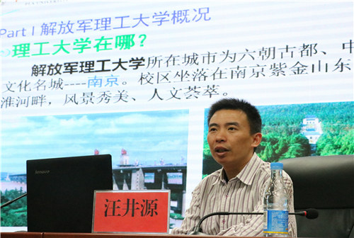 会议伊始,全体国防生通过观看解放军信息工程大学招生宣传介绍,初步了解了解放军信息工程大学的历史沿革、发展概况、学科建设、招生计划等各方面基本情况。随后,汪井源对其中的内容进行讲解,并对解放军理工大学近年来对于在校国防生的招生要求做了详细的介绍。并就学院信息、学科情况和研究方向进行了详细地讲解,对相关学院的科研成果进行了简要介绍。汪井源讲到,信息化对于军队建设有着极为重要的意义,科学技术亦是建设现代化军队的重要保障,希望更多的学子能得到深造,为科技强军做出自己的贡献。最后,汪井源对提问同学做出了耐心详细的解答。